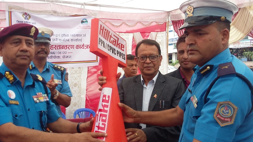 तस्बिर पनि छ । जिल्ला ट्राफिक कार्यालय कास्कीलाई ट्राफिक कोण हस्तान्तरण गर्दै पोखरा महानगरपालिका प्रमुख मानबहादुर जिसी र डिआइजी विनोद शर्मा घिमिरे ।