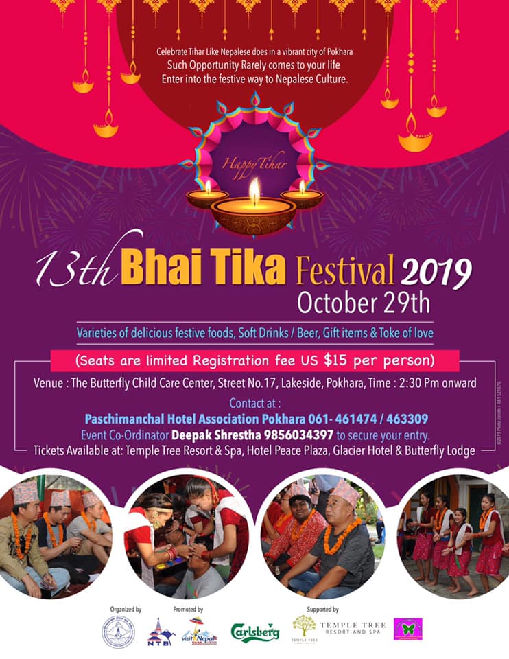 पश्चिमाञ्चल होटल संघले प्रत्येक वर्ष भाइटिका महोत्सवको आयोजना गर्दै आएको छ । महोत्सव कात्तिक १२ गते हुने आयोजकले जानकारी गराएको छ । उक्त महोत्सव लेकसाइड स्थित बटरफ्लाई चाइल्ड केयर सेन्टरमा हुने तयारी सुरु भएको छ ।