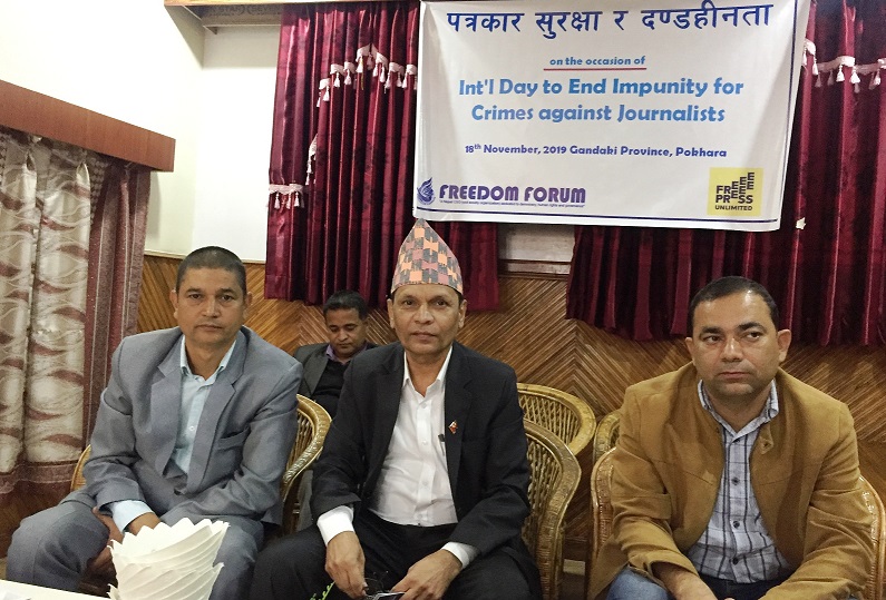 पत्रकार विरुद्ध हुने दण्डहिनता अन्त्यका लागि सबैले सहयोग गर्नुपर्नेमा एक कार्यक्रममा जोड दिइएको छ । पत्रकार विरुद्ध हुने अपराधको दण्डहीनता अन्त्यसम्बन्धी अन्तर्राष्ट्रिय दिवसको सन्दर्भमा फ्रिडम फोरमले पोखरामा सोमवार ‘पत्रकार सुरक्षा र दण्डहीनता’ विषयमा आयोजना गरिएको कार्यक्रममा सो कुरामा जोड दिइएको हो । सहभागीहरुले राज्य र गैरराज्य दुबैले आचारसंहिता पालना गर्ने हो भने दण्डहिनता न्यूनिकरण हुने बताए ।