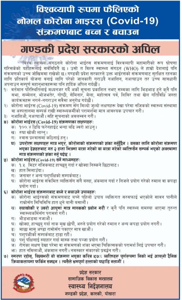 चैत्र २९, कोभिड १९ कोरोना भाइरस रोकथामका लागि राज्ले घोषणा गरेको लकडाउनसँगै बिपन्न परिवारलाइ हातमुख जोर्न धौधौ भएको छ । यस्ता परीवारको पहिचान गर्दै देशभरका स्थानिय तहले राहत बितरण गरेका छन् । सामाजिक संजालमा फोटो प्रदर्शन गर्ने प्रवृत्तिमाथी आलोचना हुन थालेपछी स्याङजाको वालिङ नगरपालिकाले रहात बितरणको अबधिमा फोटो खिच्न प्रतिबन्ध लगाएको छ । गरीब, मजदुर लगाएत बिपन्न परीवारको प्रतिष्ठामा आँच आउने बिषयलाइ मध्यनजर गर्दै यस्तो निर्णय गरिएको नगरप्रमुख दिलीप प्रताप खाँणले बताउनुभयो ।