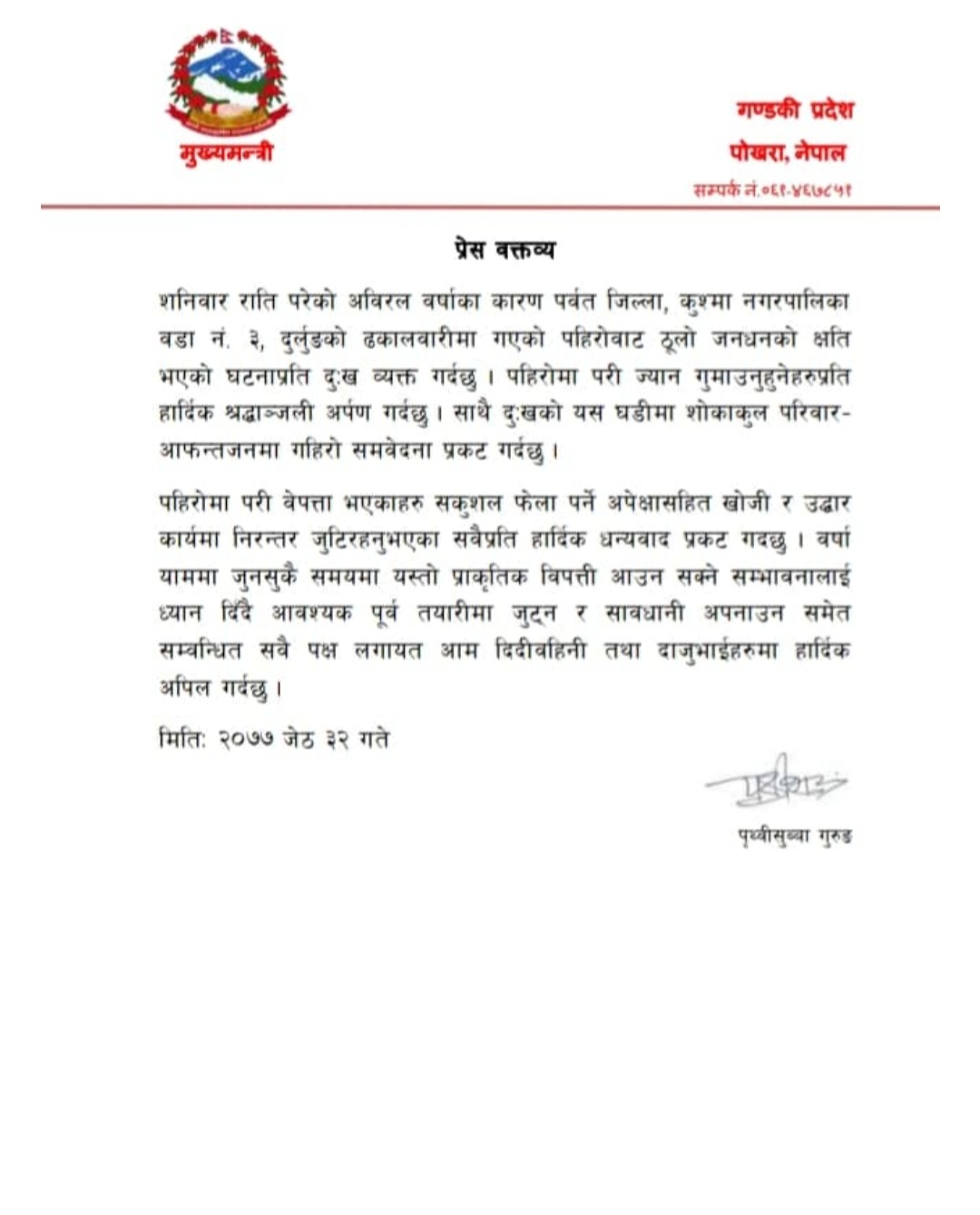जेठ ३२, पर्बत कुस्मा नगरपालिका ३ दुर्लुङमा गए राति गएको पहिरोमा परी ज्यान गुमाउने परिवर प्रति गण्डकी प्रदेशका मुख्य मन्त्री पृथ्बीसुब्बा गुरुङले दुख ब्यक्त गरेका छन ।