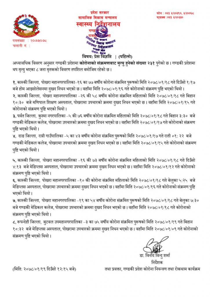 यस्तै पछिल्लो २४ घण्टामा पोखराका ५ जना सहित गण्डकी प्रदेशमा कोरोना सङ्क्रमणबाट थप ८ जनाको मृत्यु भएको छ । स्वास्थ्य निर्देशनालय गण्डकी प्रदेशका अनुसार प्रदेशमा कोरोनाबाट मृत्यु हुनेको कुल सङ्ख्या २ सय ३१ पुगेको छ । प्रदेशमा अहिले सबैभन्दा बढी संक्रमित कास्कीमा रहेका छन् । कास्कीमा मात्र १२ सय भन्दा धेरै सक्रिय संक्रमित रहेको निर्देशनालयले बताएको छ ।