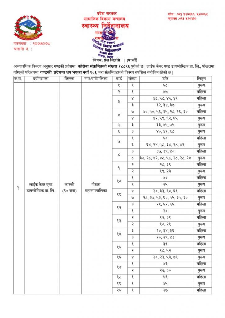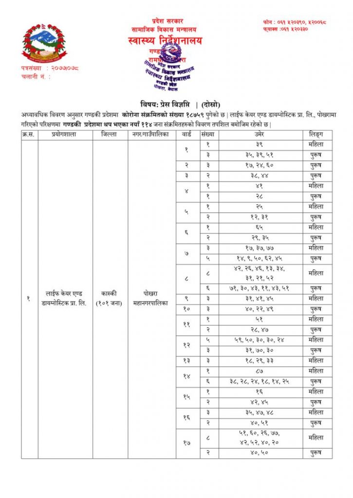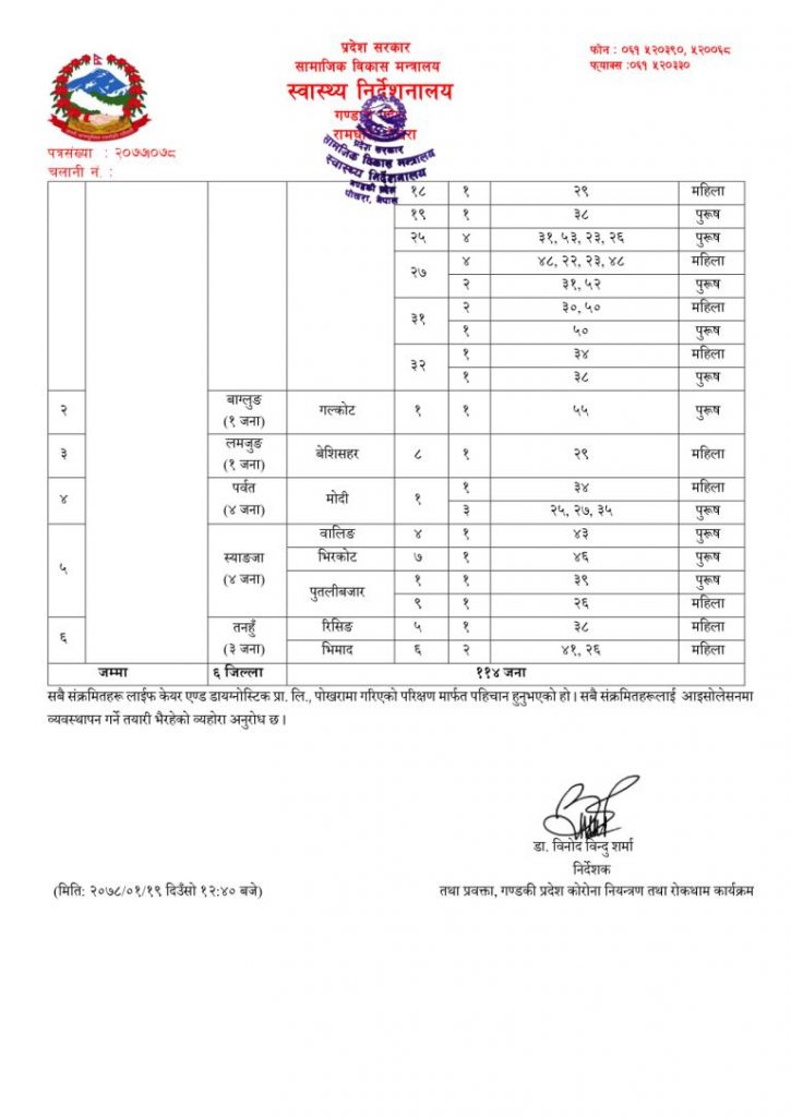 यस्तै, स्याङ्जाका १ सय ४ जनामा, नवलपुरका २९ जनामा, म्याग्दीका २३ जनामा, मुस्ताङका १३ जनामा, तनहुँका १४ जनामा, लमजुङका ८ जनामा, पर्वतका ९ जनामा र मनाङ र बाग्लुङका ४–४ जनामा संक्रमण पुष्टि भएको निर्देशनालयको बिज्ञप्तिमा उल्लेख छ ।
